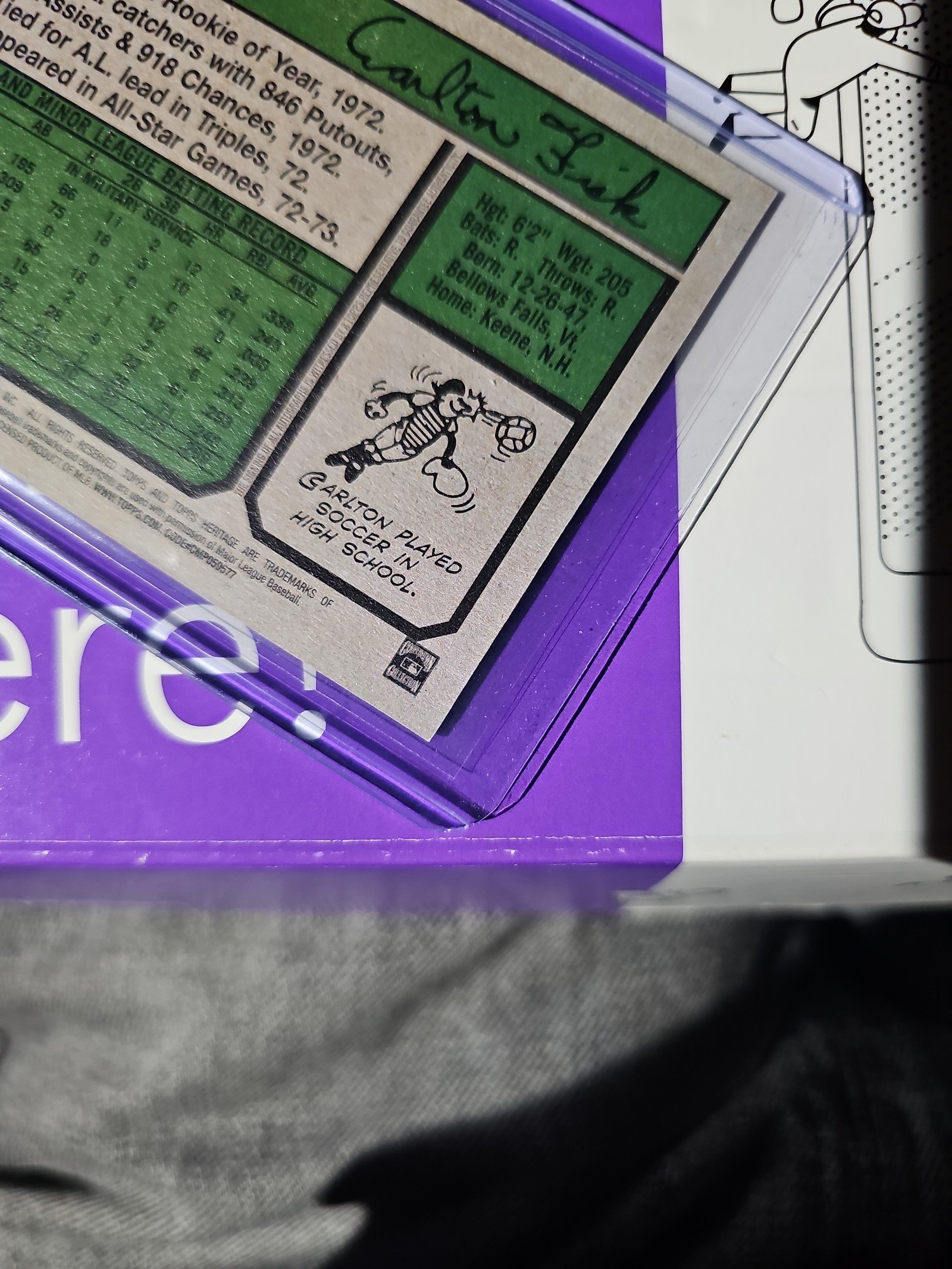 Carlton Fisk is in his Red Sox Uniform with his back catching gear on. Carlton Fisk has been a Hall of Famer since the year 2000. 11 time All Star. 3 Silver Slugger Awards. 1 Gold Glove Award & was Rookie of the Year in 1972. Carlton Fisk played for the Boston Red Sox & Chicago White Sox over a 24 year old career.