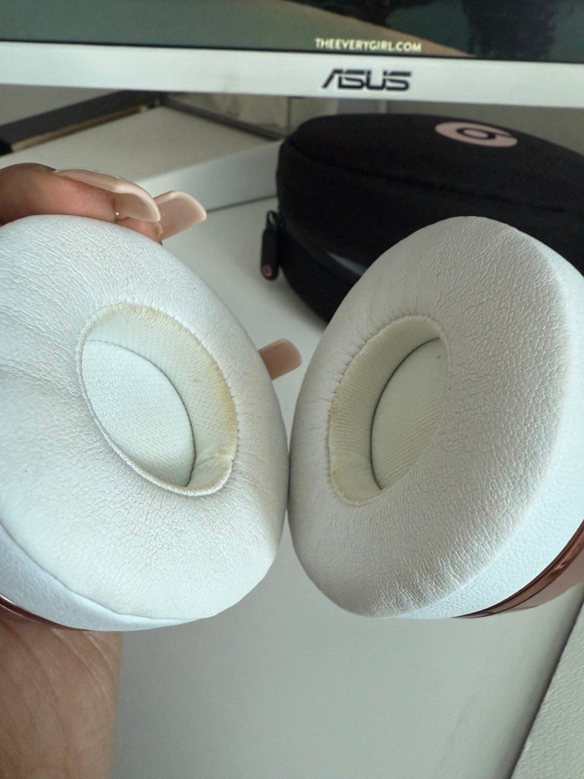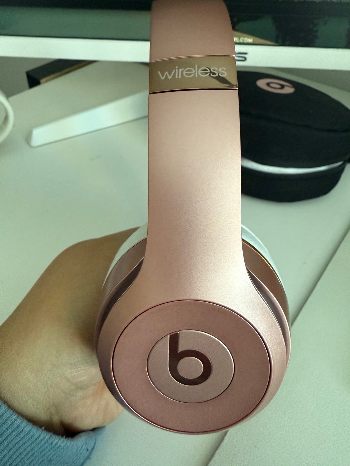 Like new beats solo wireless headphones. Only used for about seven months. There is a tiny bit of discoloration on the ears, but it doesn't affect functionality. Will be sanitized before they sent. Comes with case and charging cable.