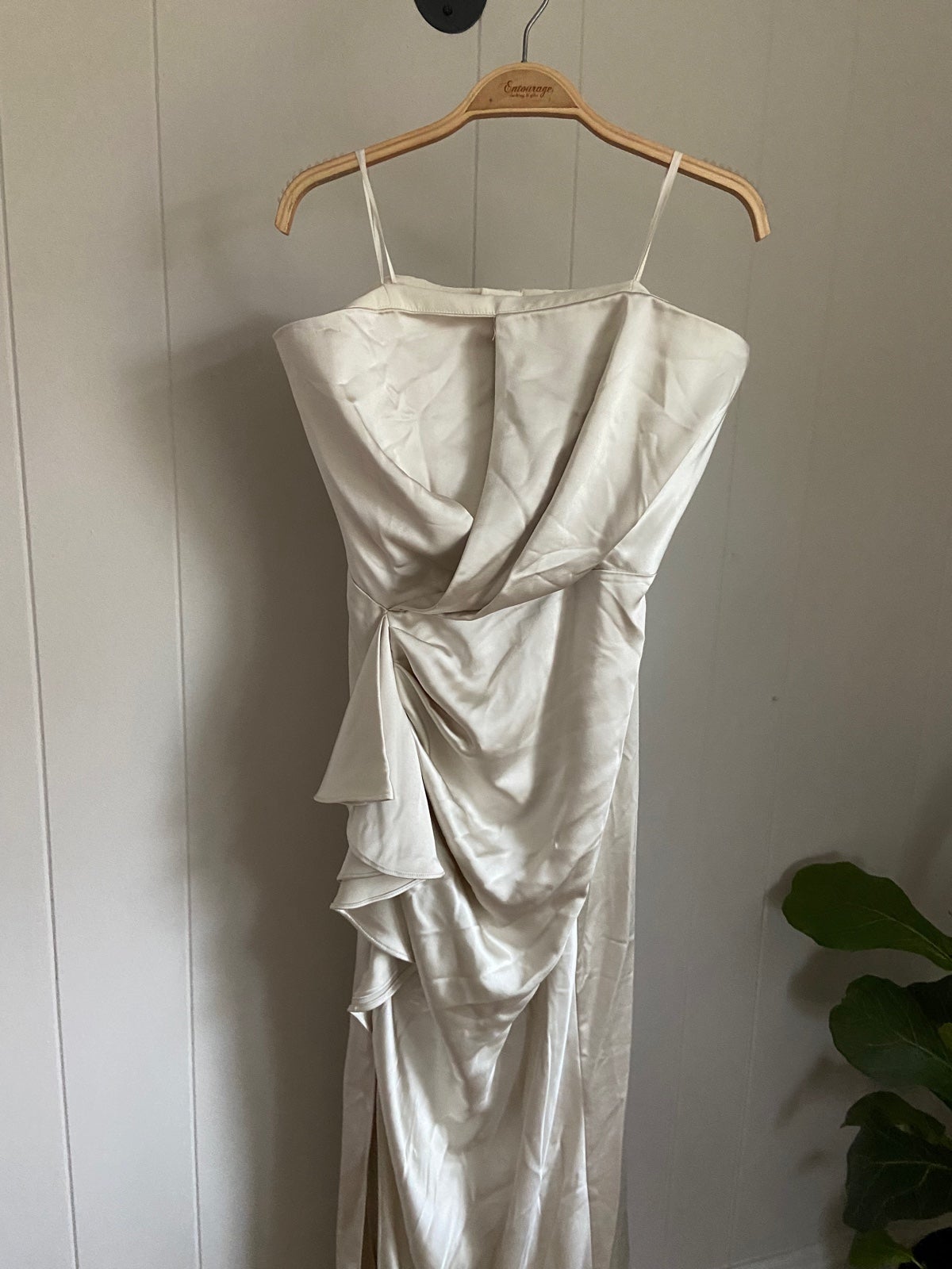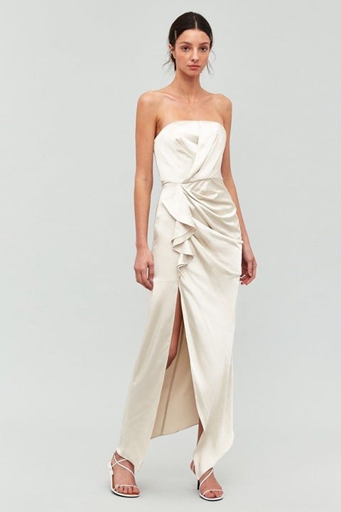 This silky ecru fitted gown features a strapless boned bodice, draped detail and an elegant front high leg slit. Finished with a hidden back zipper closure.