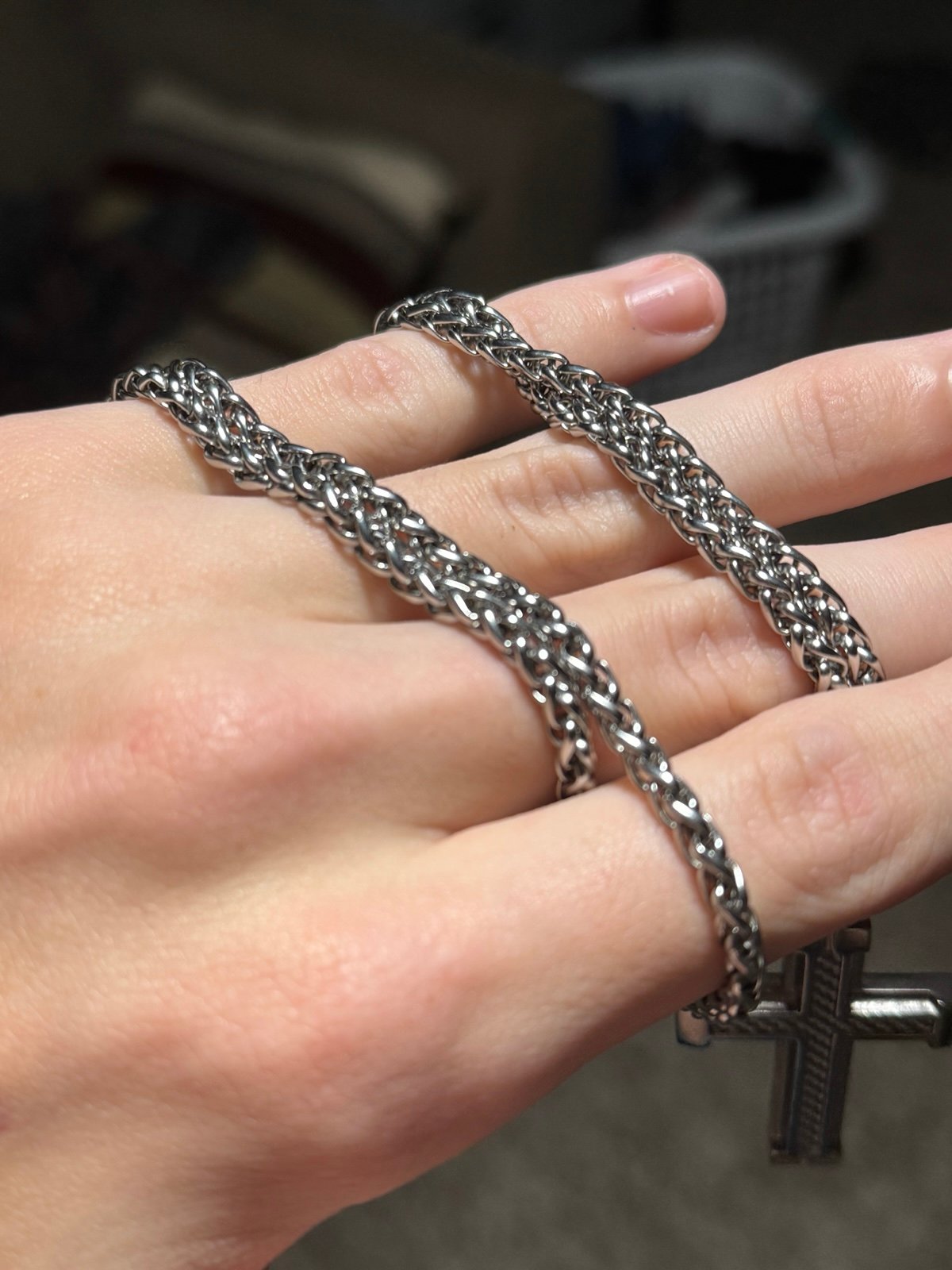 This necklace features a classic cross pendant. The cross pendant has a unique screen printed pattern as its design. A silver border encloses the screen printed pattern. This necklace features a 24 inch silver tone wheat chain.