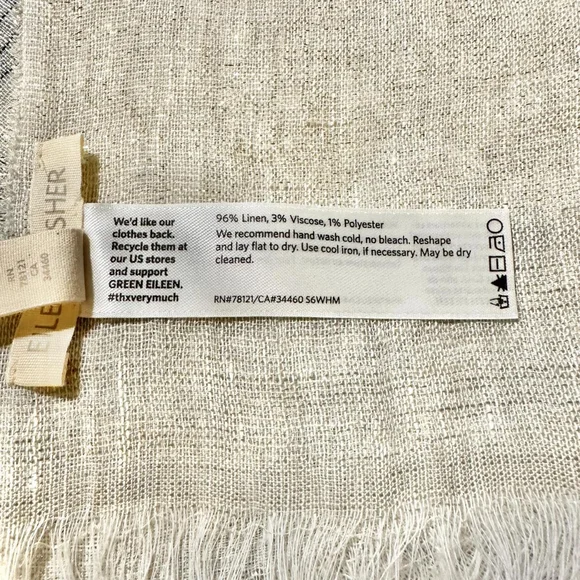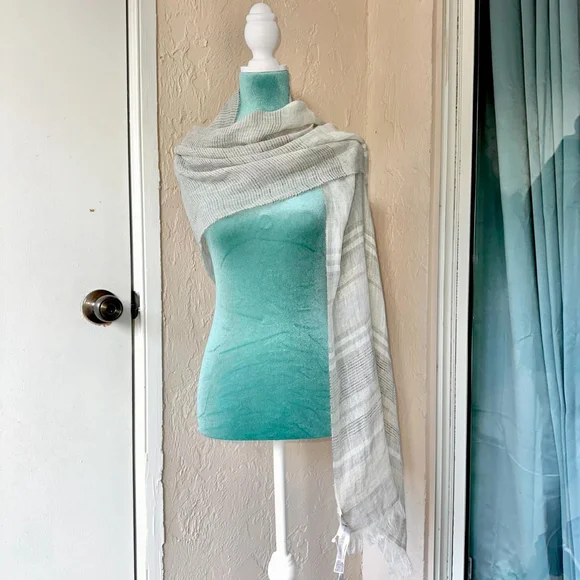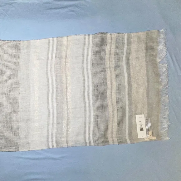 Eileen Fisher Linen Whimsey scarfNew with tags, never worn. Features a striped print in shades of cream, taupe, white, black, grey and gold shimmer.96% linen, 3% viscose, 1% polyester, organically grown in Europe. The scarf is made of a lightweight, sheer fabric and has fringe at the ends. It measures approximately 82" L x 20" W.#luxury #designer #organic #sustainable #natural lightweight sparkly