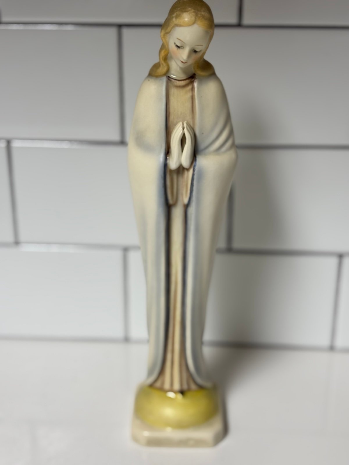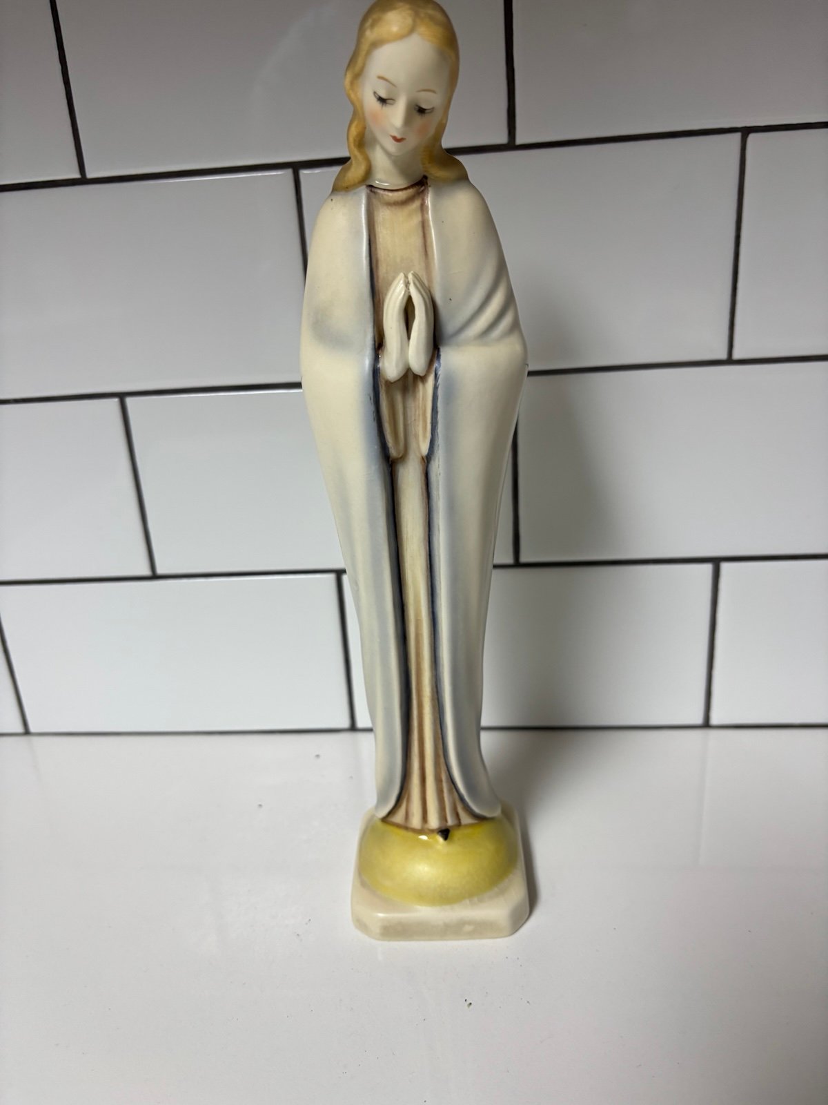 The Goebel Hummel 'Praying Madonna' Figurine Statue from Germany is a medium-sized, white porcelain figurine featuring a religious theme. It is signed by the renowned brands Hummel and Goebel, and represents the Mid 20th Century era of collection.