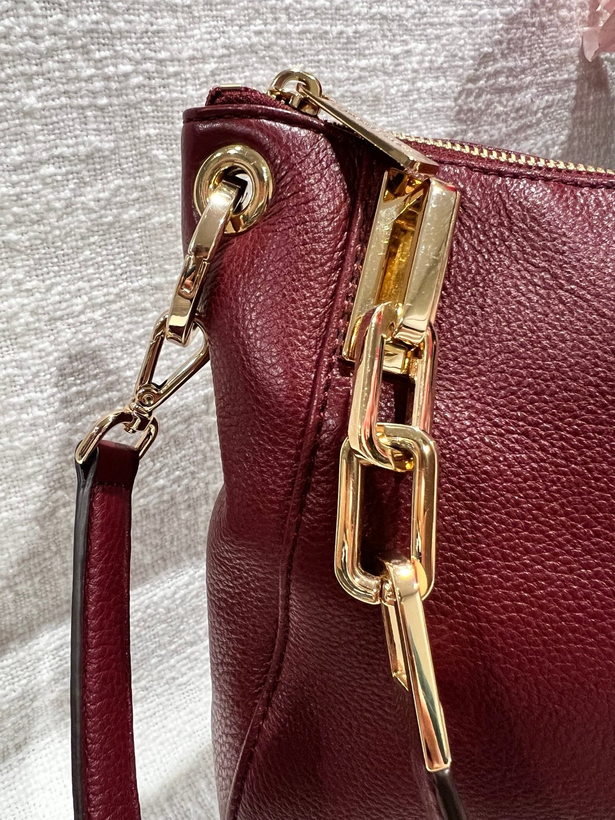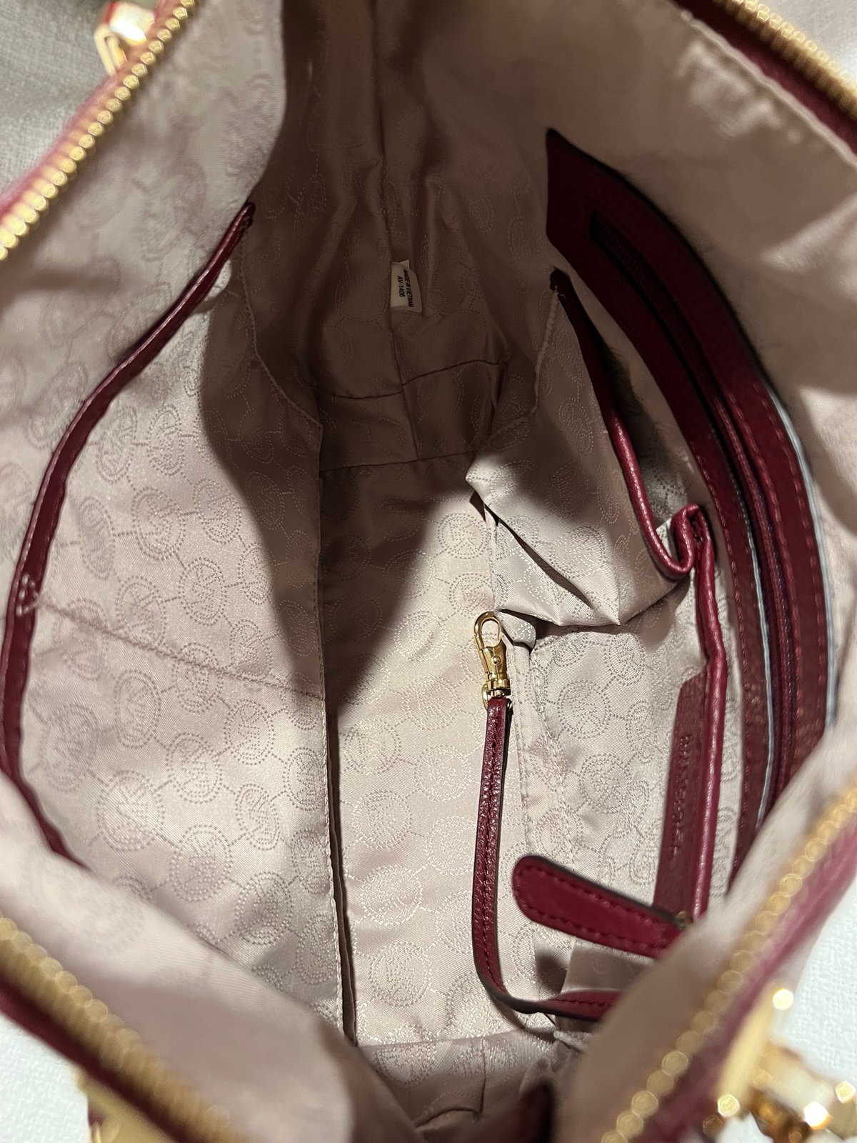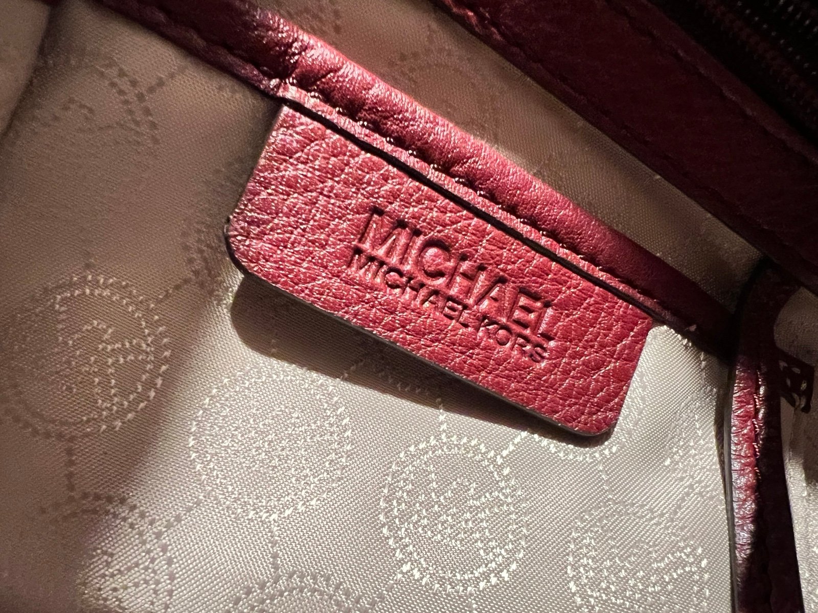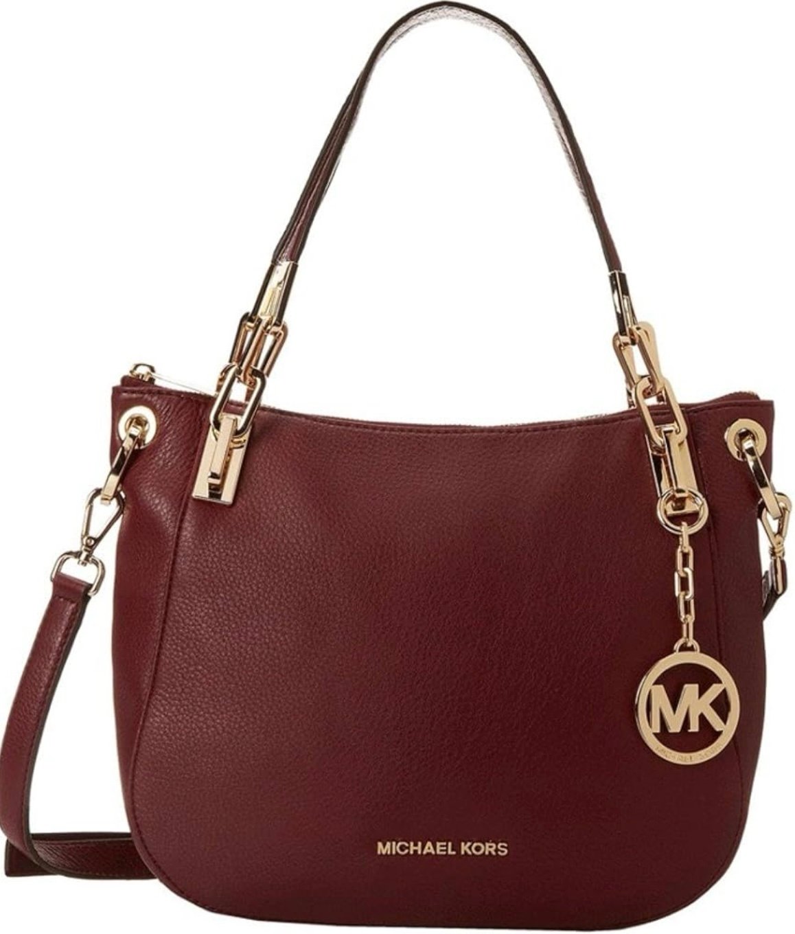 Michael Kors Brooke medium shoulder tote in claret leather.Zipper closure. Top hand with detachable, adjustable crossbody strap. Signature logo hardware. Hanging logo medallion on side. Lined interior features zipper pocket and four slip pockets. Dimensions: 9 inches H x 12 inches W x 3.4 inches D Michael Kors 30H3GOKE2L