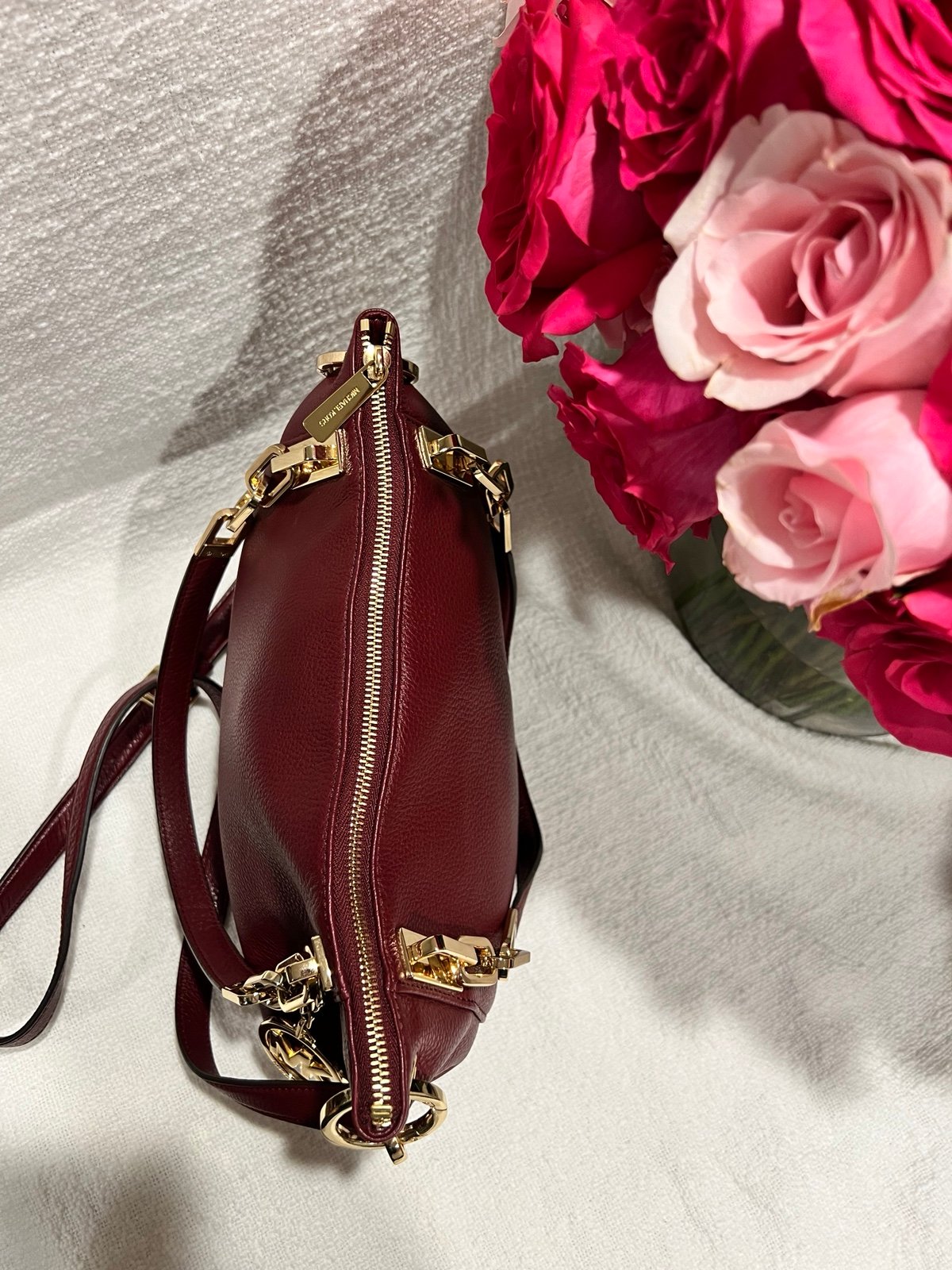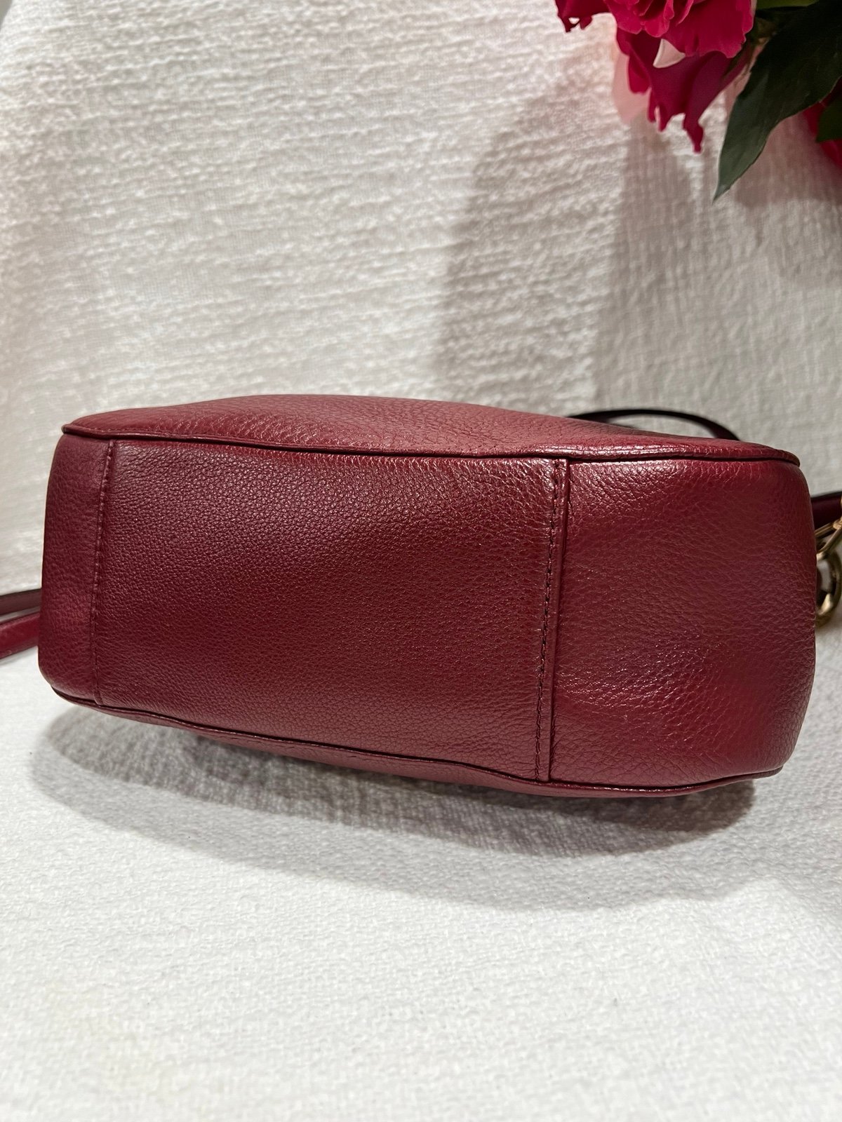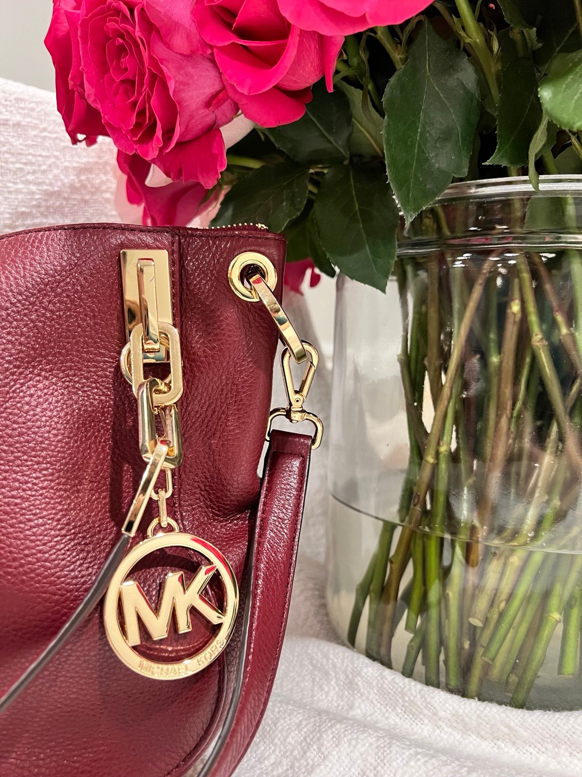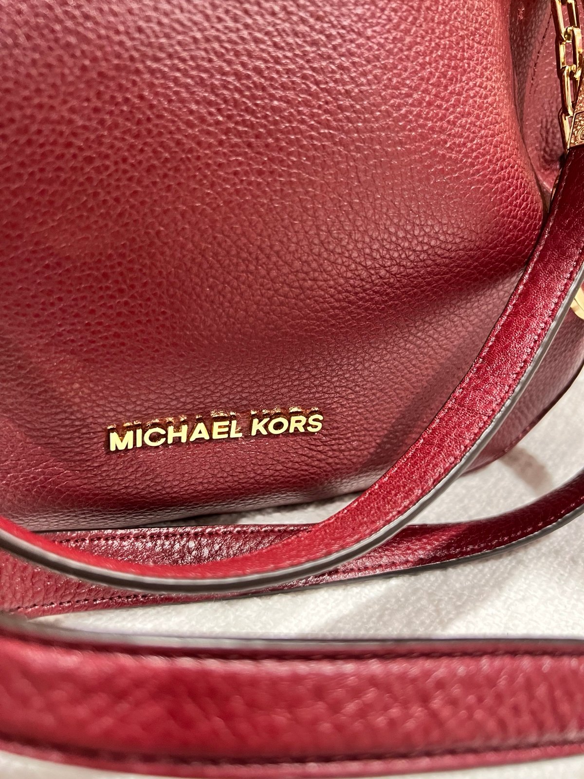 Michael Kors Brooke medium shoulder tote in claret leather.Zipper closure. Top hand with detachable, adjustable crossbody strap. Signature logo hardware. Hanging logo medallion on side. Lined interior features zipper pocket and four slip pockets. Dimensions: 9 inches H x 12 inches W x 3.4 inches D Michael Kors 30H3GOKE2L