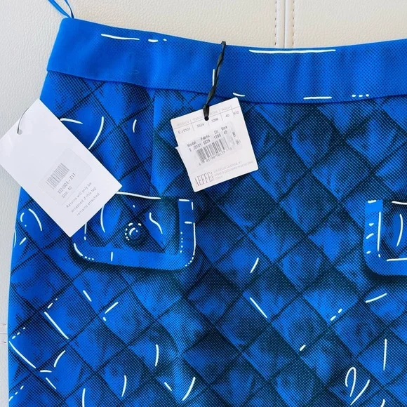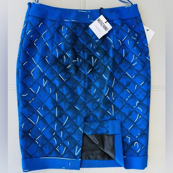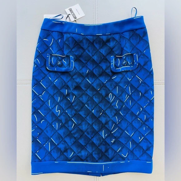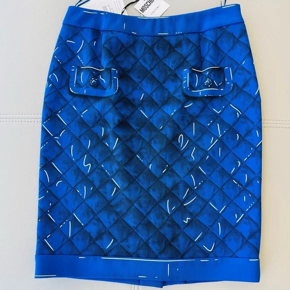 New 🦋Moschino Couture Blue Checkered Pencil Skirt US Size 6Fully Lined in Black SatinFaux Front Pockets Side Zip$999 RetailNWTSo FASHIONABLE Wear with a Black Teeor dress it up with a fitted jacket.Love it with an off-the-shoulder top.Great investment Great conversation piece Will never go out of style, A FOREVER SKIRT!MADE IN ITALYMoschino skirt in blue, white, black Printed Fully linedConcealed hook and zip fastening at sideFits true to size/order your normal sizeTop of Knee-lengthHigh-waistMid-weight//non-stretchy fabric21” long18” from natural hipBrand new with tags