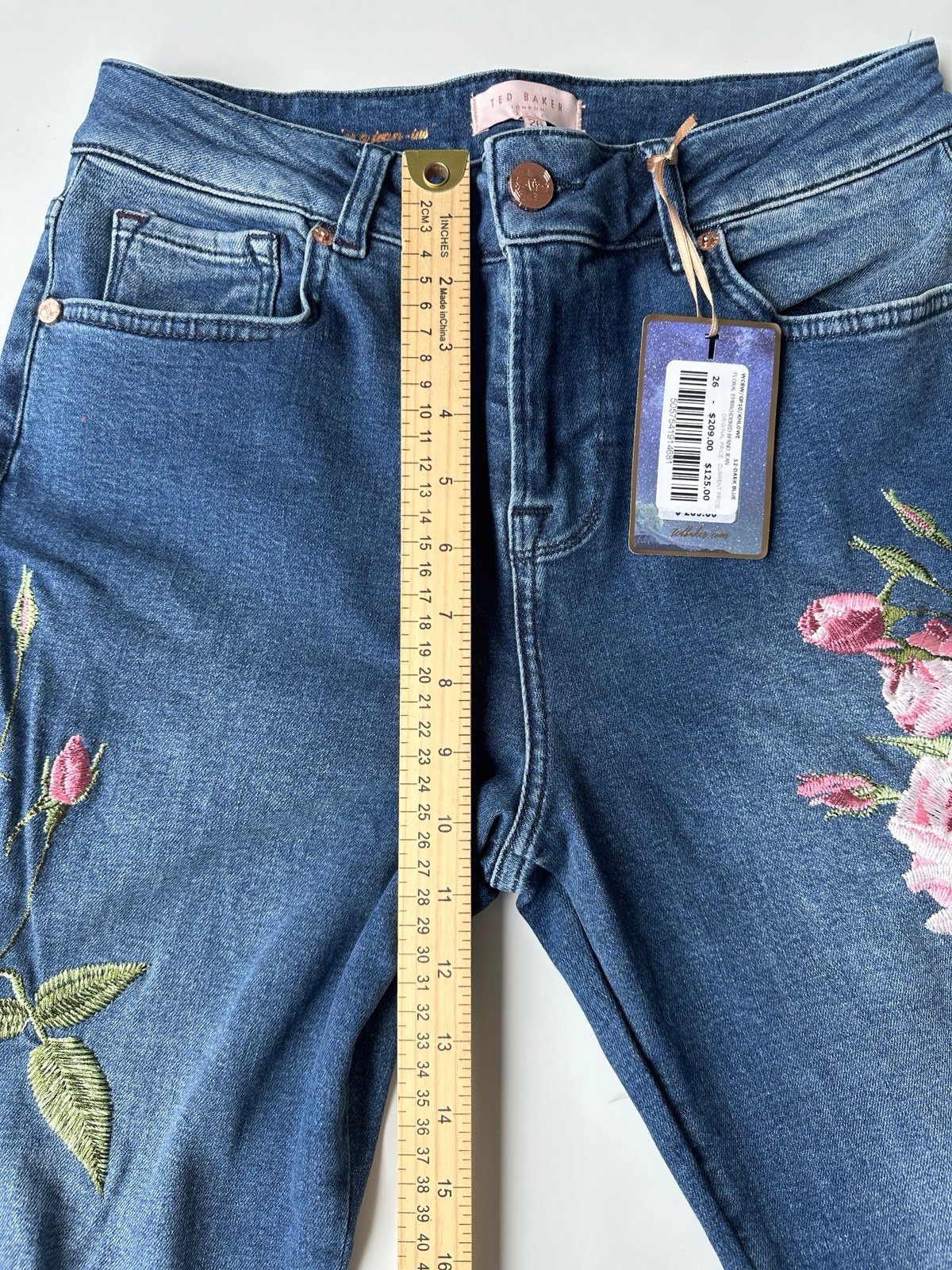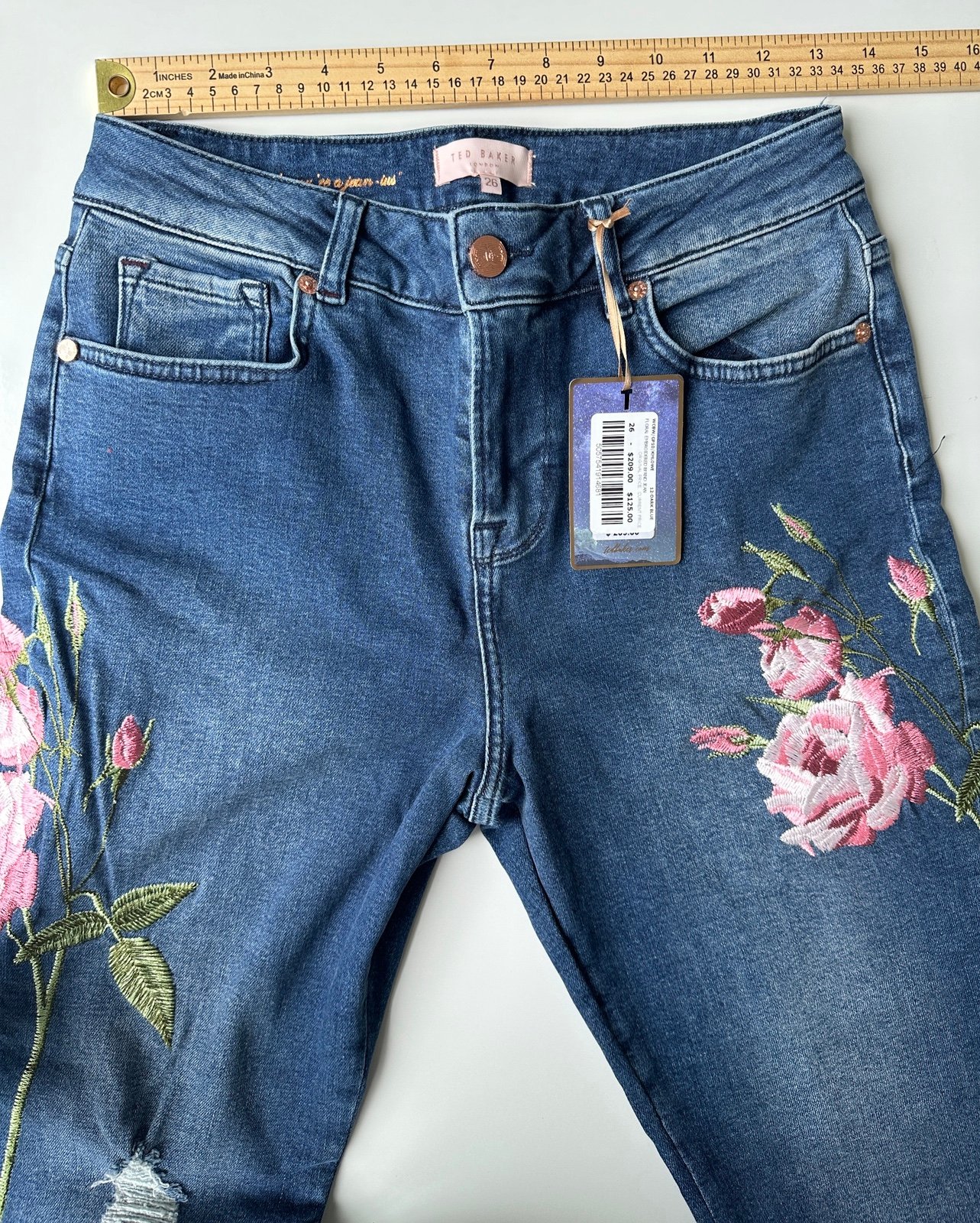 NWT Ted Baker Khlowe Boyfriend Floral Embroidered Cropped Blue Jeans Women’s 26