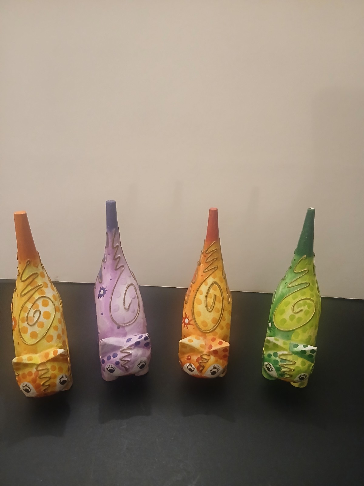 Victor Bonomo Set of 4 folk art hand painted and carved wooden napkin rings in the shape of a stretching cat with the tail extended up, colors are orange, yellow, green and purple, each decorated with flowers, dots and gold swirls, hole in the center for the Napkin, excellent condition.