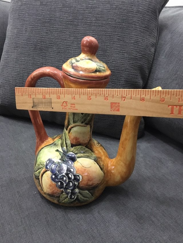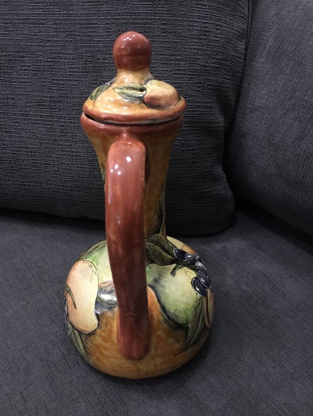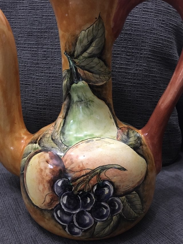 WITH A BEAUTIFUL HANDLE AND SPOUT PAINTED DESIGN OF PURPLE GRAPES, GREEN PEARS, PEACHES AND MANGOES