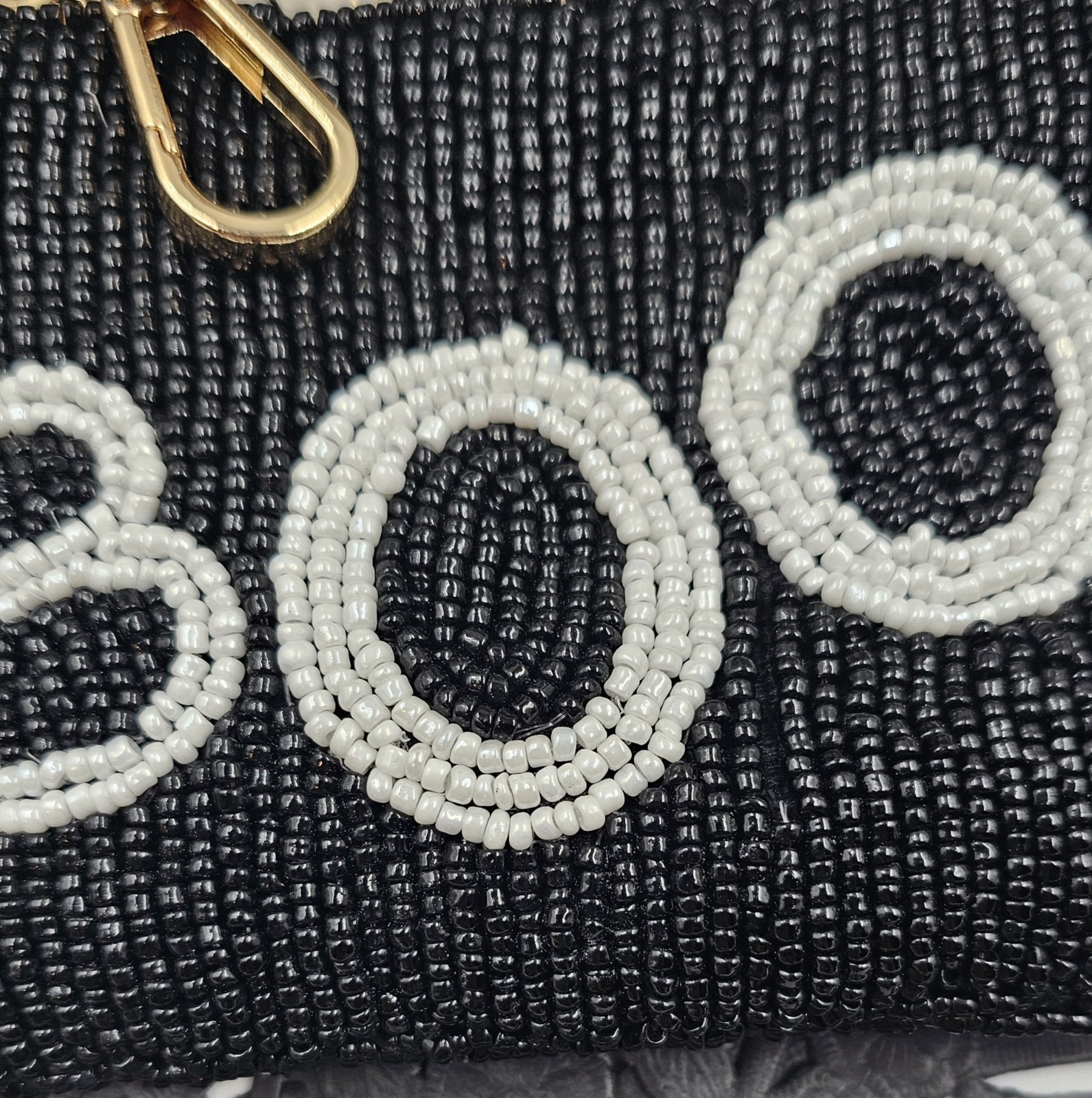 “BOO!” Coin Purse: Compact and clip-on style for cards, cash, or keys — features bold beaded lettering and a matching ghost on the back.